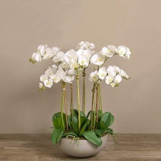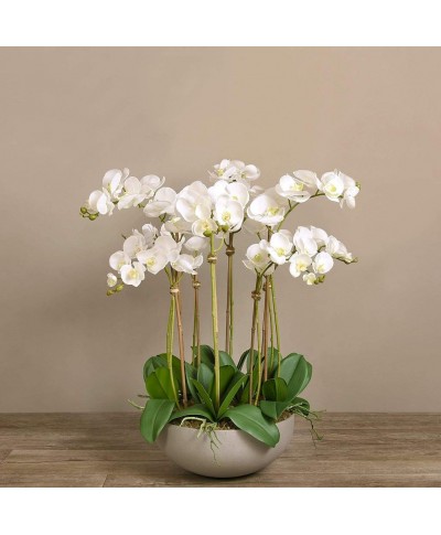 • The sleek stems and smooth texture of the sandstone pot make this arrangement a chic addition to any room.