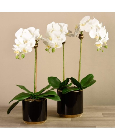 • Their sleek black pot beautifully contrasts against the green leaves and white, yellow, or pink blooms.