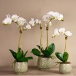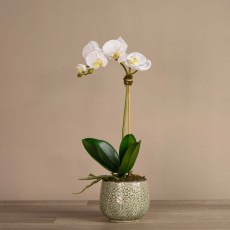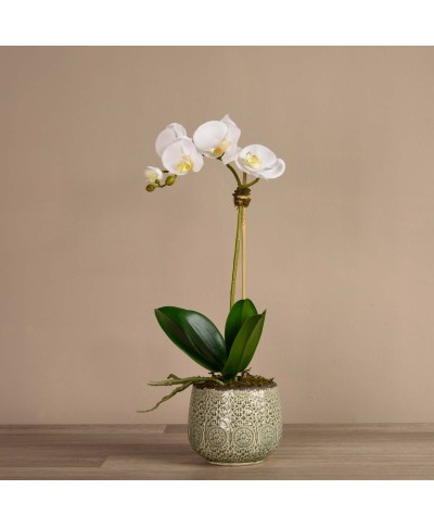 A beautiful mix of contemporary design and Middle Eastern flair. The clean lines of handmade silk orchids paired with an intricate sage green Moroccan-inspired ceramic pot will add an exotic touch to your living room. This arrangement is made-to-order by expert florists using real-touch orchids.
