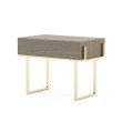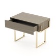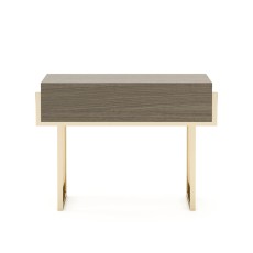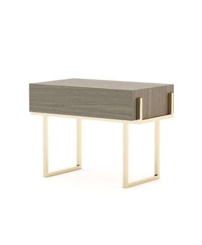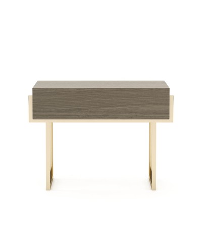 • Nereida Bedside table is a simplistic design with a metal frame and a wooden drawer.