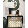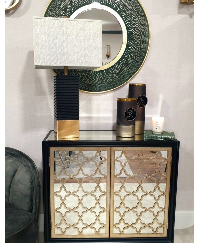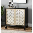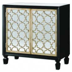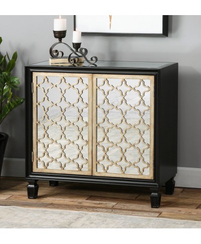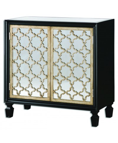 • Franzea Console Cabinet,Gloss black wooden case with an interior shelf, featuring mirrored doors inset with an intricately-cut quatrefoil lattice in burnished gold leaf.