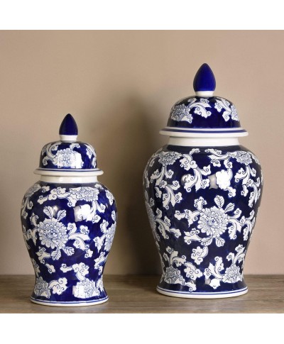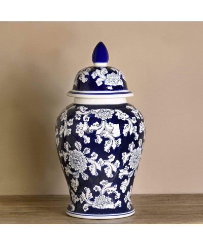 • Chic and classic. This blue and white jar features a pretty leaves pattern, an easily removable lid, and plenty of storage space.