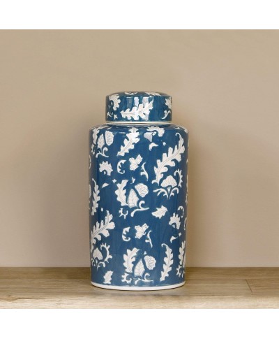 • Chic and classic. This blue and white jar features a pretty leaves pattern, an easily removable lid, and plenty of storage space.
