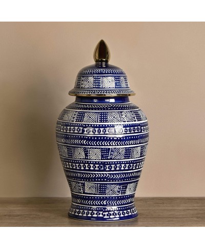• Chic and classic. This blue and white jar features a pretty leaves pattern, an easily removable lid, and plenty of storage space.