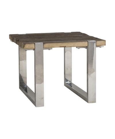 • The wood perfectly showcases the natural beauty of its history in this coffee table. The reclaimed wood side table is complemented by the clever use of stainless steel for the legs.